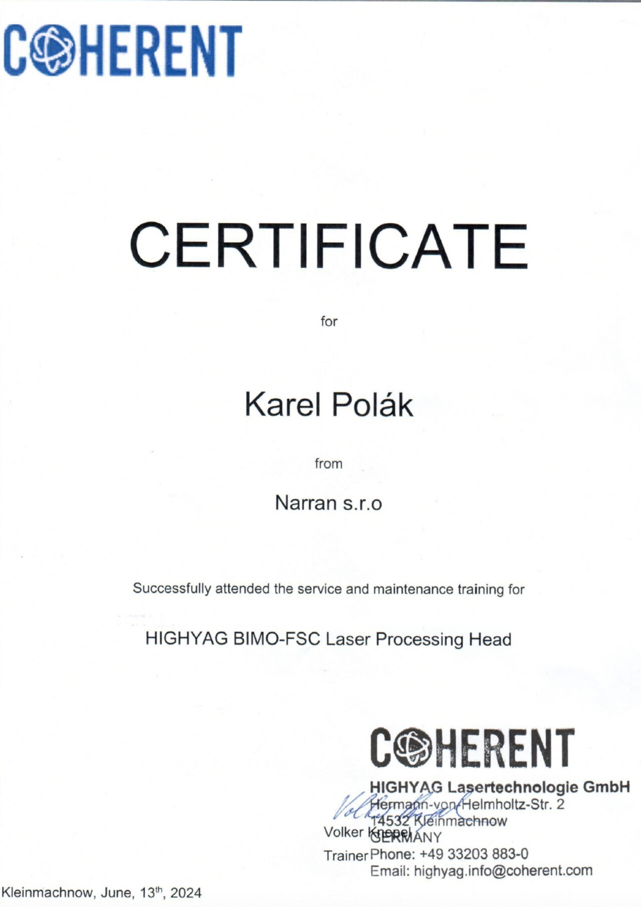Náš kolega úspěšně absolvoval servisní a údržbové školení společnosti Coherent / HIGHYAG se zaměřením na laserovou procesní hlavu BIMO-FSC: