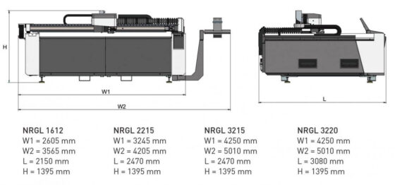 NRGL laserový plotr je standartně osazován kvalitními laserovými zdroji předních světových výrobců s výkony od 150 W do 350 W. NRGL je schopen řezat materiály až do tloušťky 90 mm. Automatizovaná Z osa má zdvih 70 mm. Stroj zpracovává rozlišení rastrových formátů až do 1200 dpi.