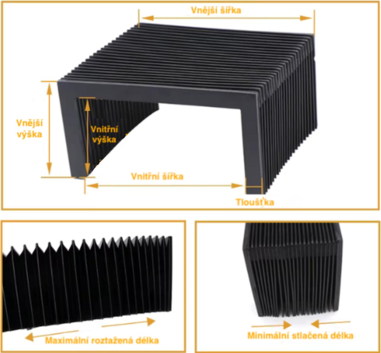 Dodáváme krycí měchy se zvýšenou odolností. Měchy (harmoniky) jsou požívány na ochranu pojezdů X, Y a osy Z, nebo optických drah.